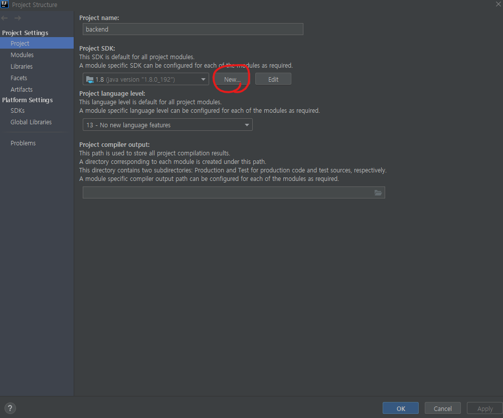 - Project Settings > Project에서 Project SDK:에 New를 한다.