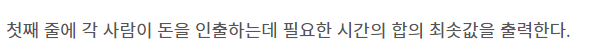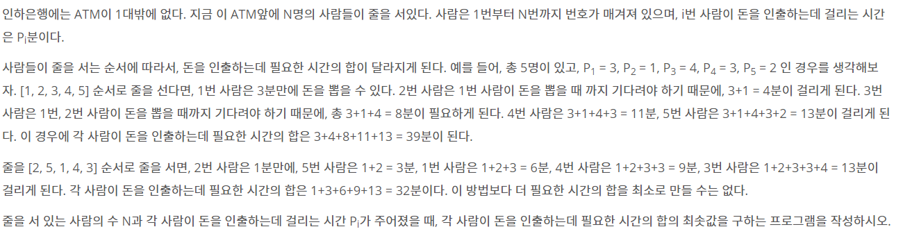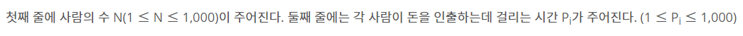 - 돈을 인출하는데 걸리는 시간을 오름차순으로 정렬해야 시간의 합이 최소값이 된다.