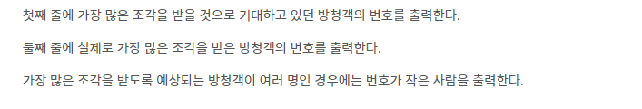 - 예상이 되는 사람과 실제 많이 받은 사람을 구분하여 조건에 충족하는 경우 출력하면 간단하다.